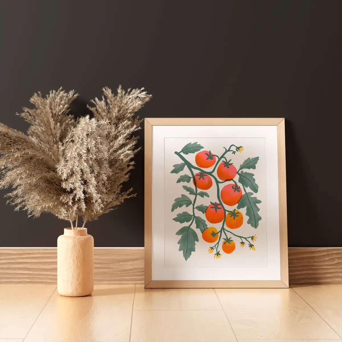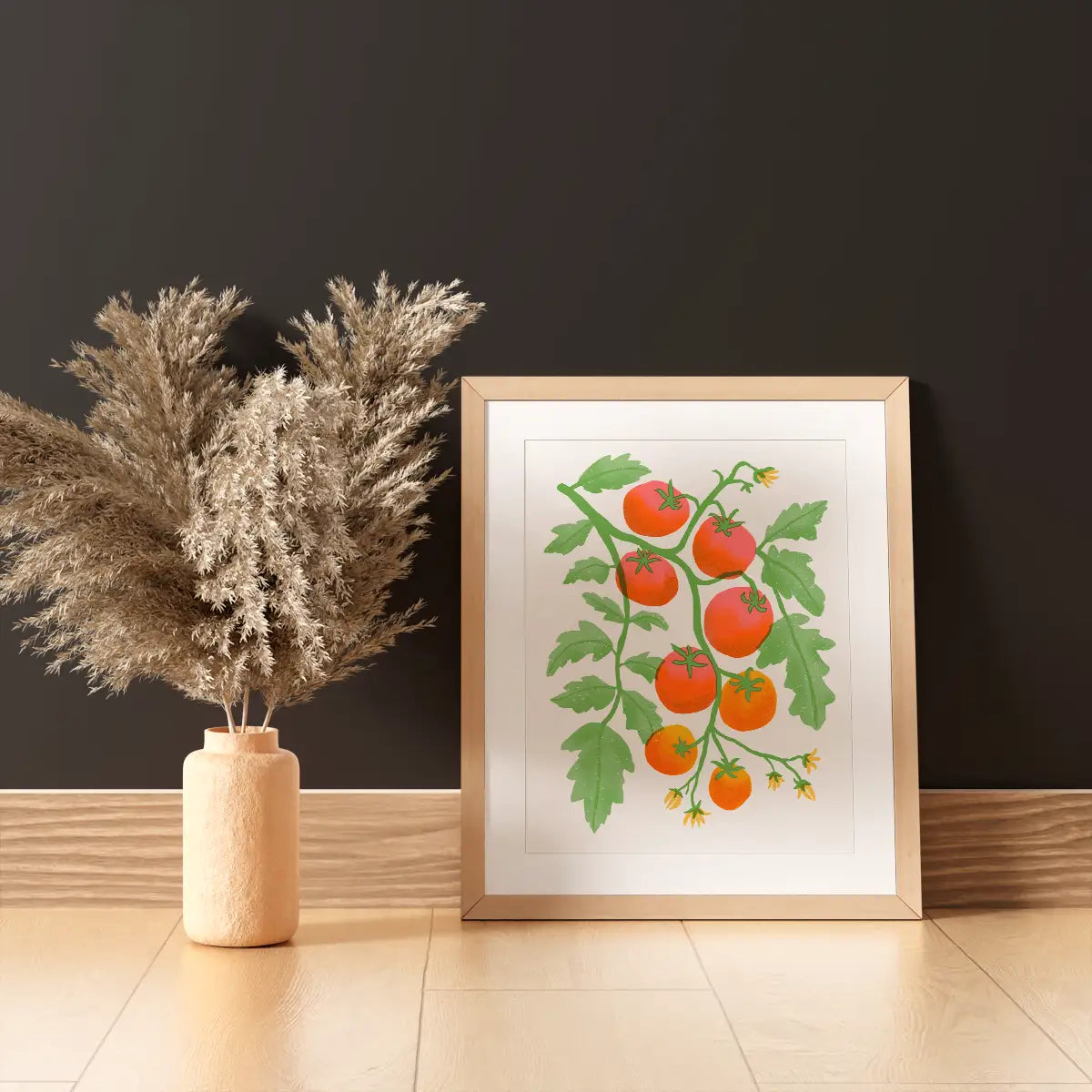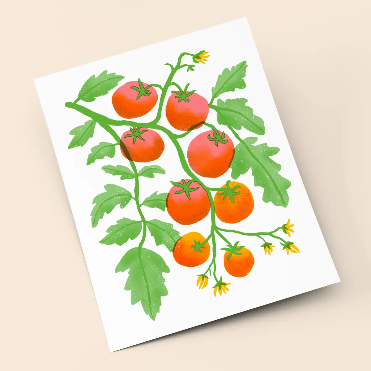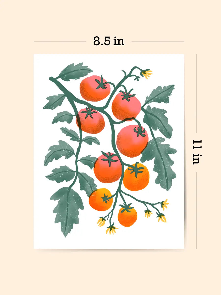 This gorgeous Risograph art print inspired by 1950's cookbook illustrations captures ripe cherry tomatoes hanging straight on the vine. Add a most delicious pop of color to your kitchen walls!