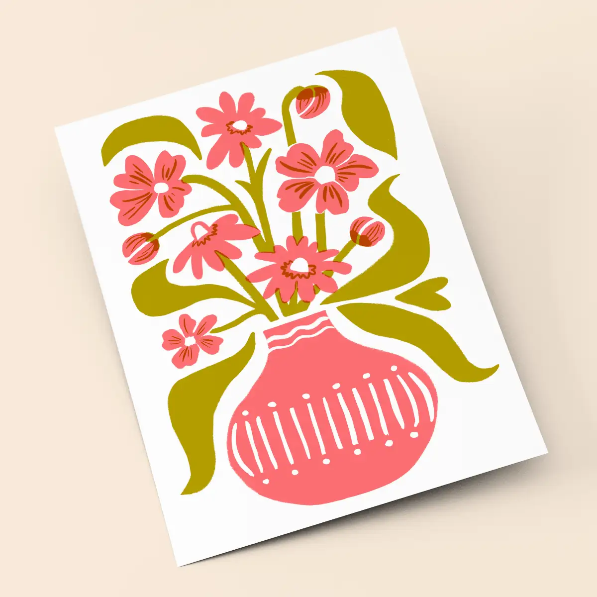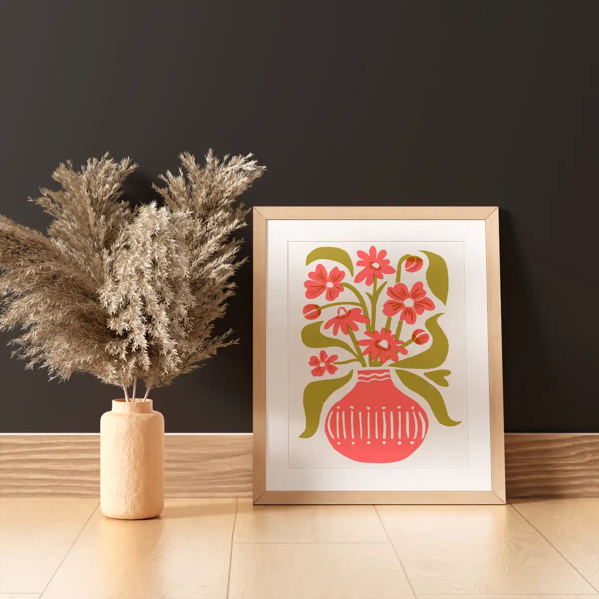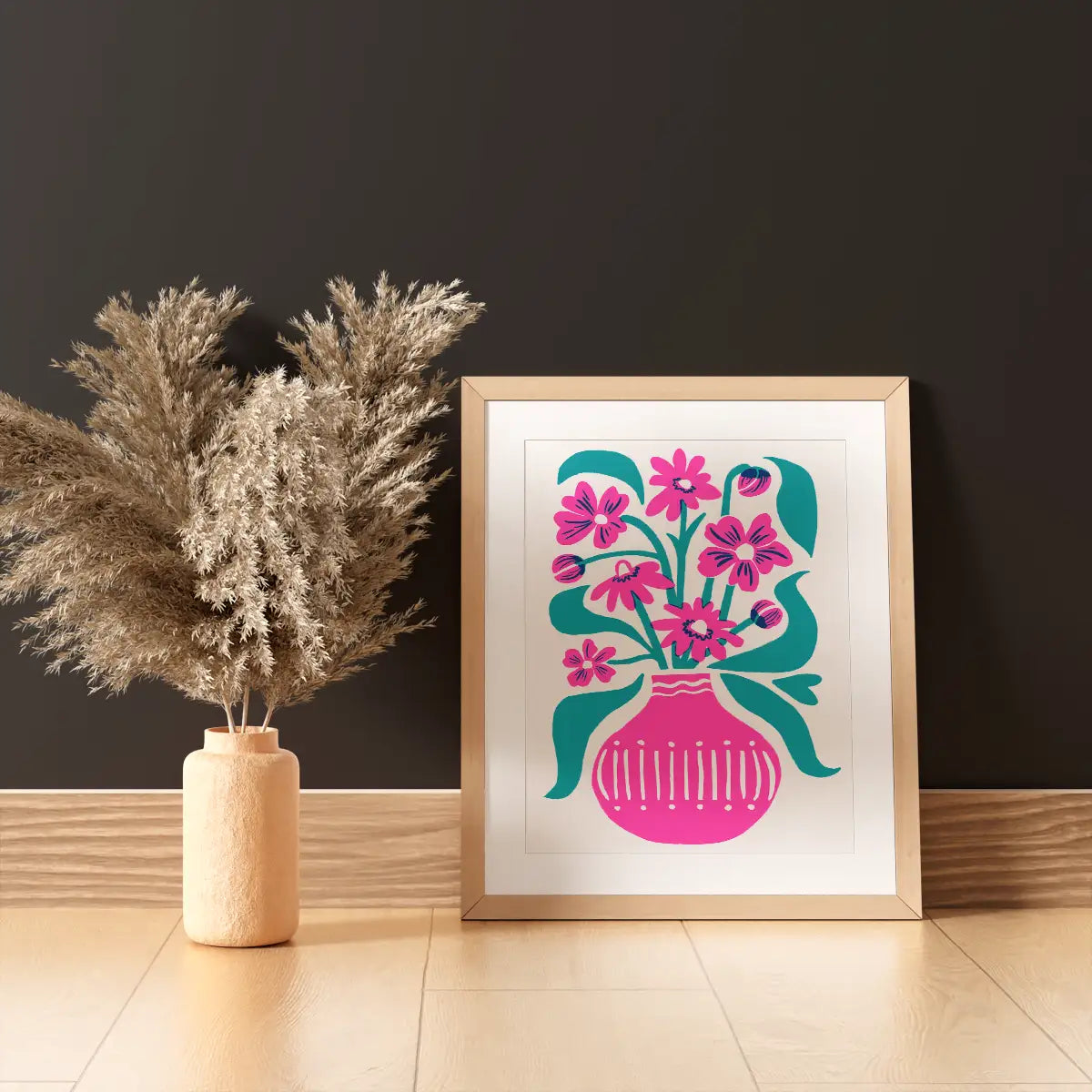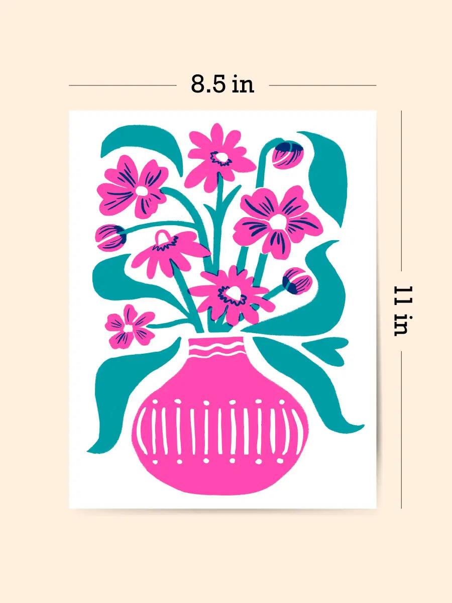 This Risograph art print features a bouquet of blooming flowers and little buds in a simple vase.