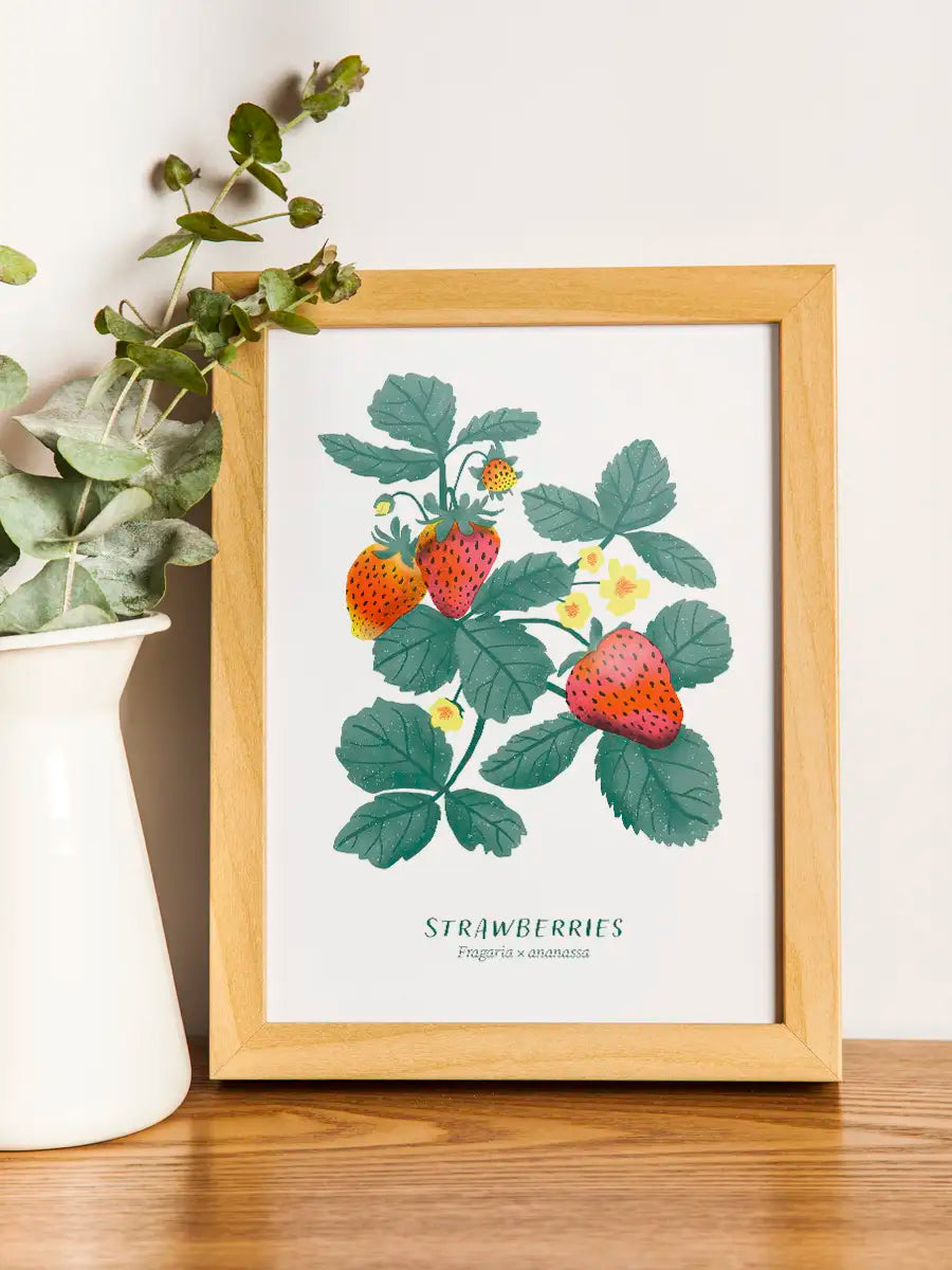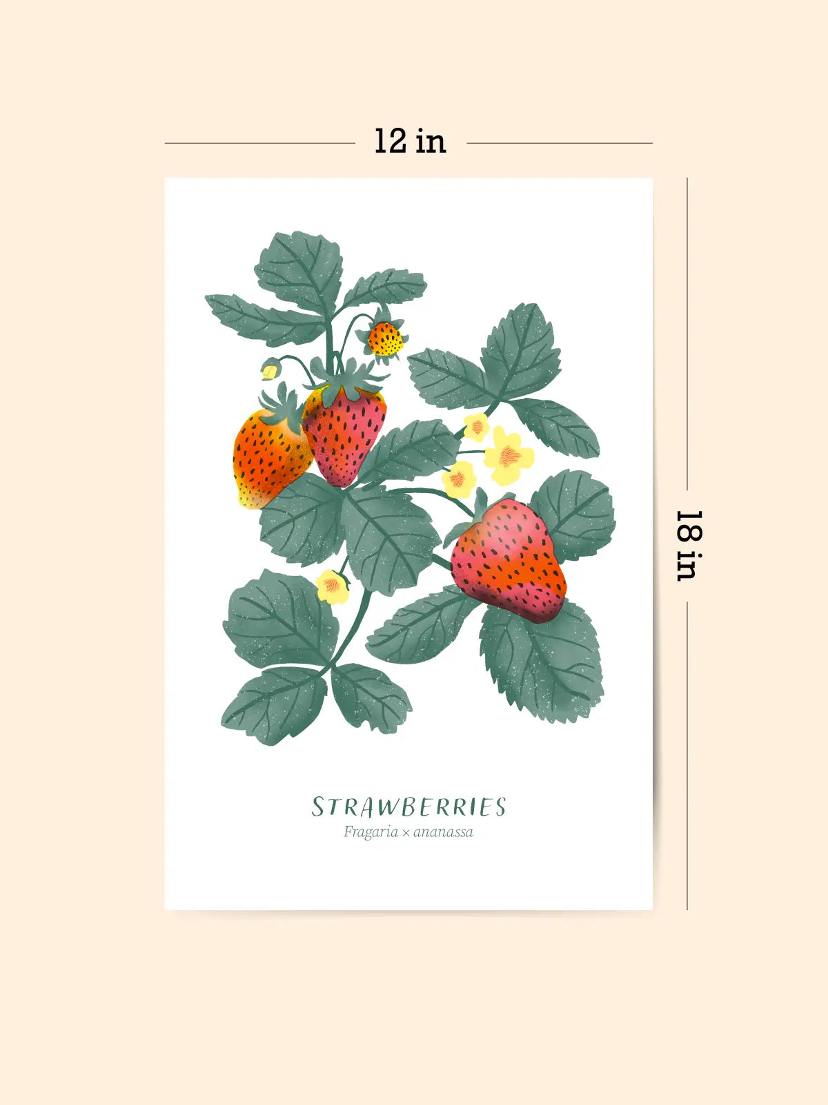This gorgeous Risograph large format botanical art print is inspired by 1950's cookbook illustrations. It perfectly captures a strawberry plant complete with ripe strawberries. This print does include the common name & scientific names below the illustration.