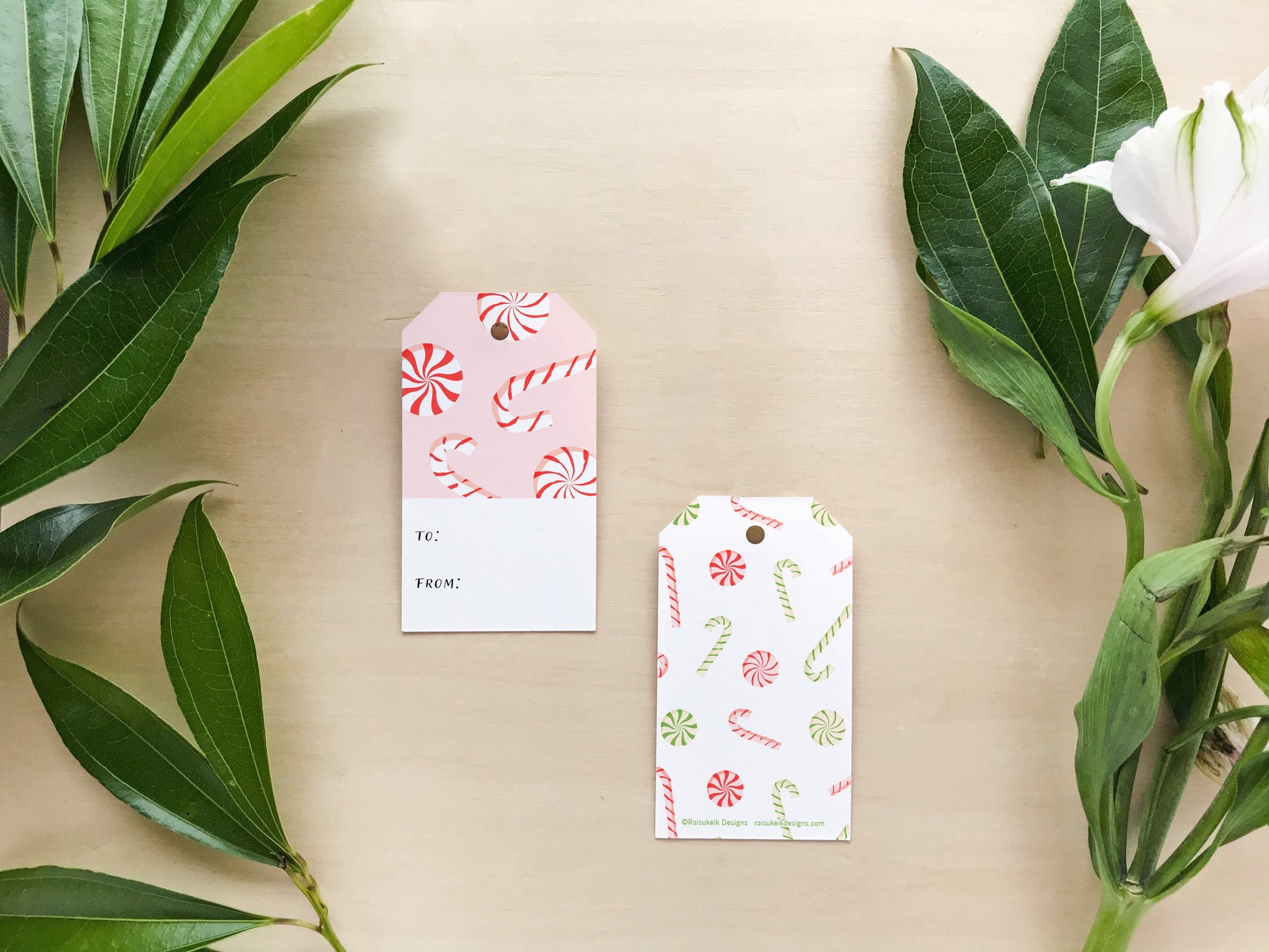 The gift tag's front features an assortment of red & green candy canes and peppermints sprinkled on top of a white background. The back offers a space for your personalized message and the recipient's name.