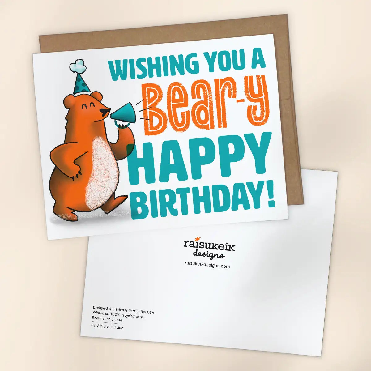 Send bear-y big smiles with this Risograph greeting card! Featuring a cute bear illustration in a party hat, it delivers the playful and bold happy birthday message. It's the perfect pun-filled card for friends and family who love humor and adorable designs.