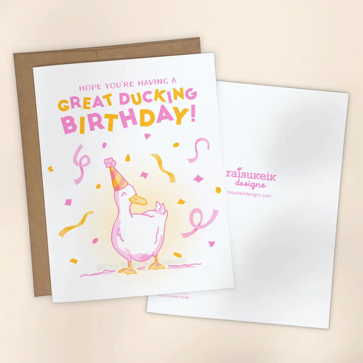 Make someone laugh out loud on their special day with this hilariously witty Risograph birthday card! Featuring a playful illustration of a duck wearing a party hat amidst falling confetti, this card delivers a ‘ducking’ clever pun.