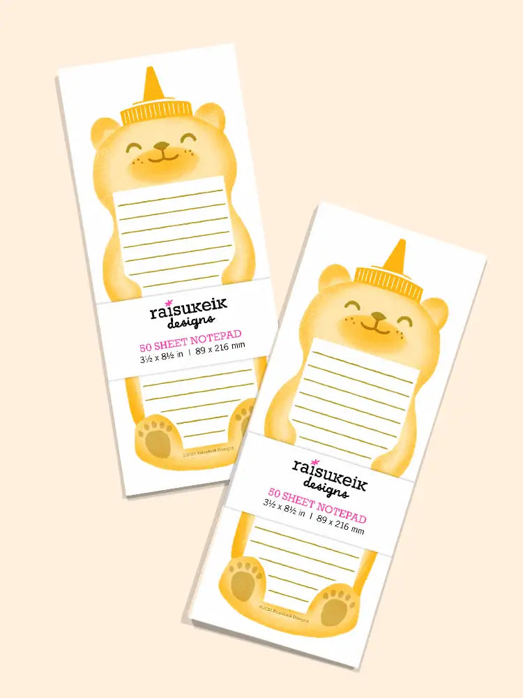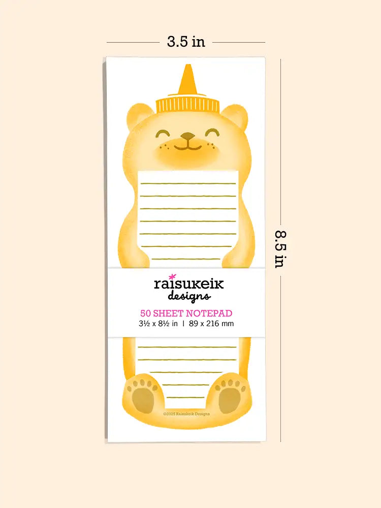 Brighten up your to-do lists with our adorable 3.5" x 8.5" lined Honey Bear Bottle notepad! This charming stationery features a smiling honey bear bottle hugging lined paper for all your notes, lists, and doodles. Each tear-away sheet gives you the perfect space to jot down your thoughts while adding a splash of sweetness to your desk or kitchen counter.