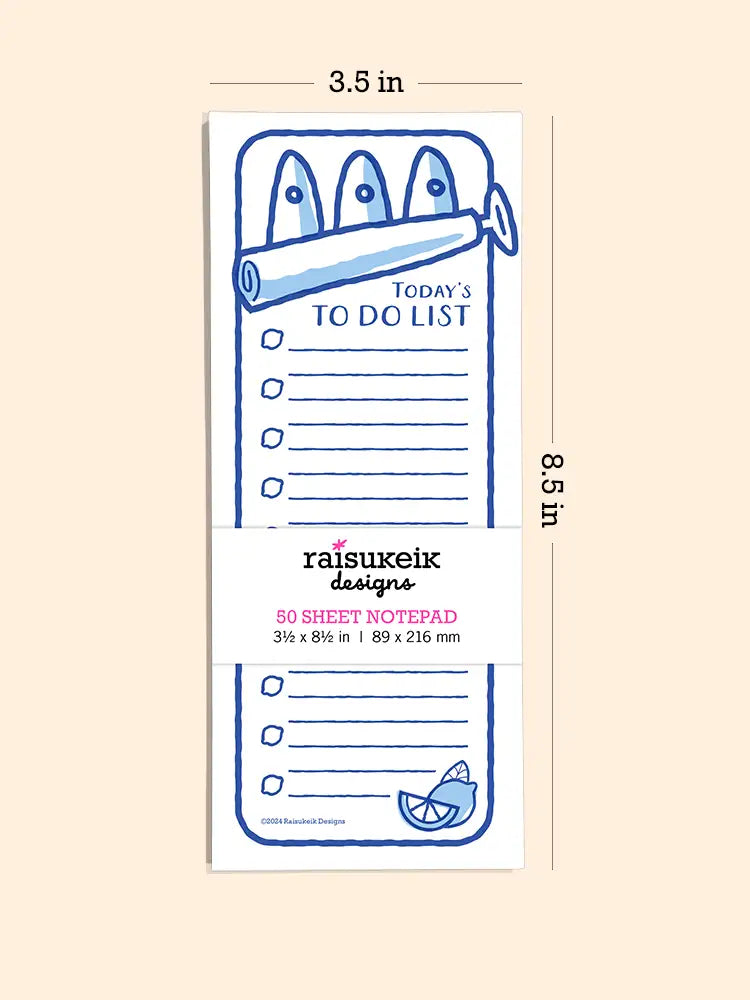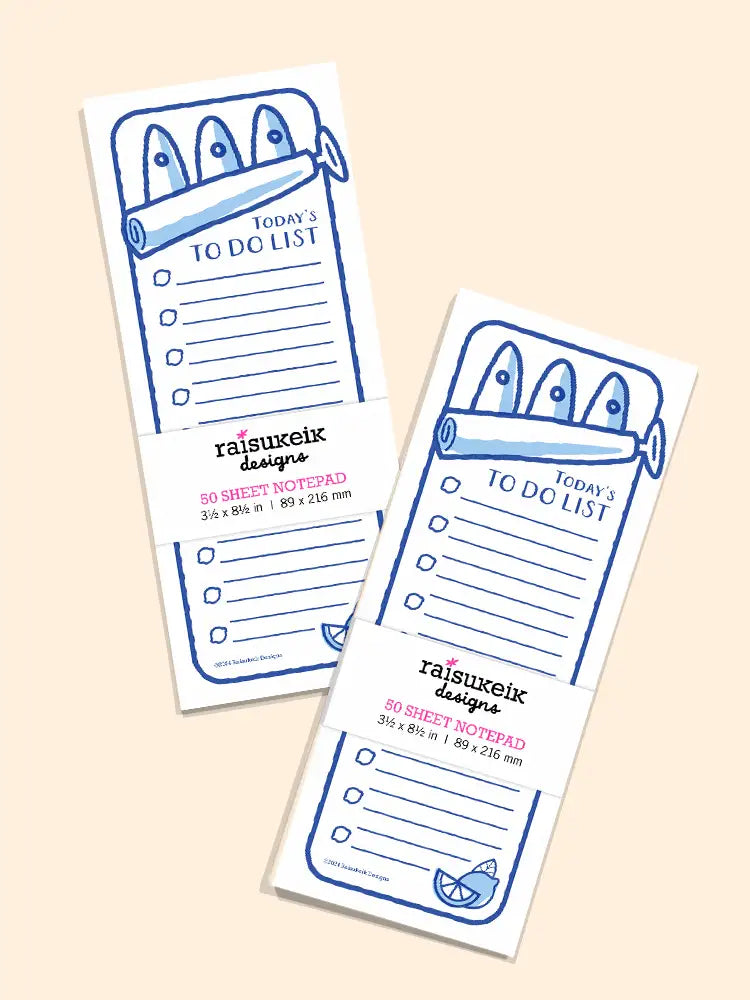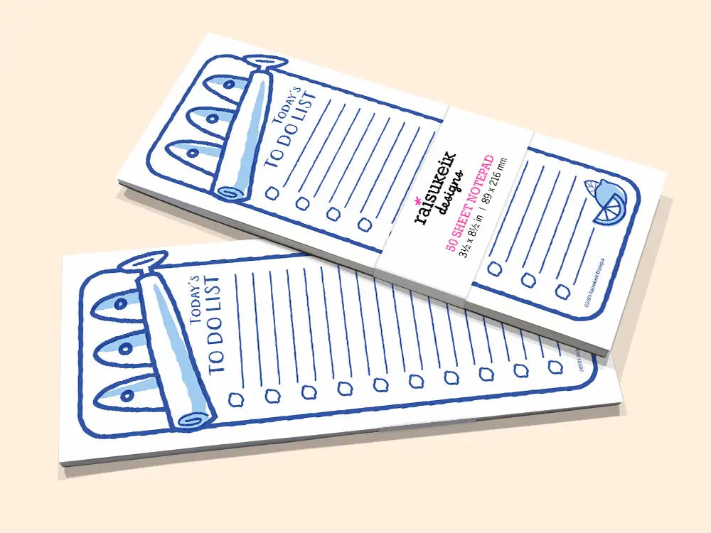 Stay organized with this 3.5" x 8.5" lined notepad designed to look like an open sardine can, complete with three sardines peeking out! Featuring Risograph-printed artwork and small checkboxes for tackling to-do lists, it’s helpful & functional. Perfect for jotting down tasks or grocery lists, this notepad makes a delightful gift for foodies or fans of quirky, cute designs.