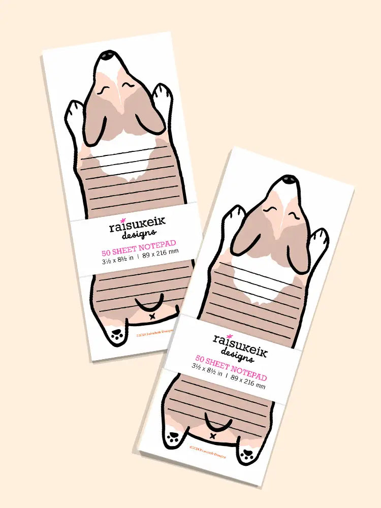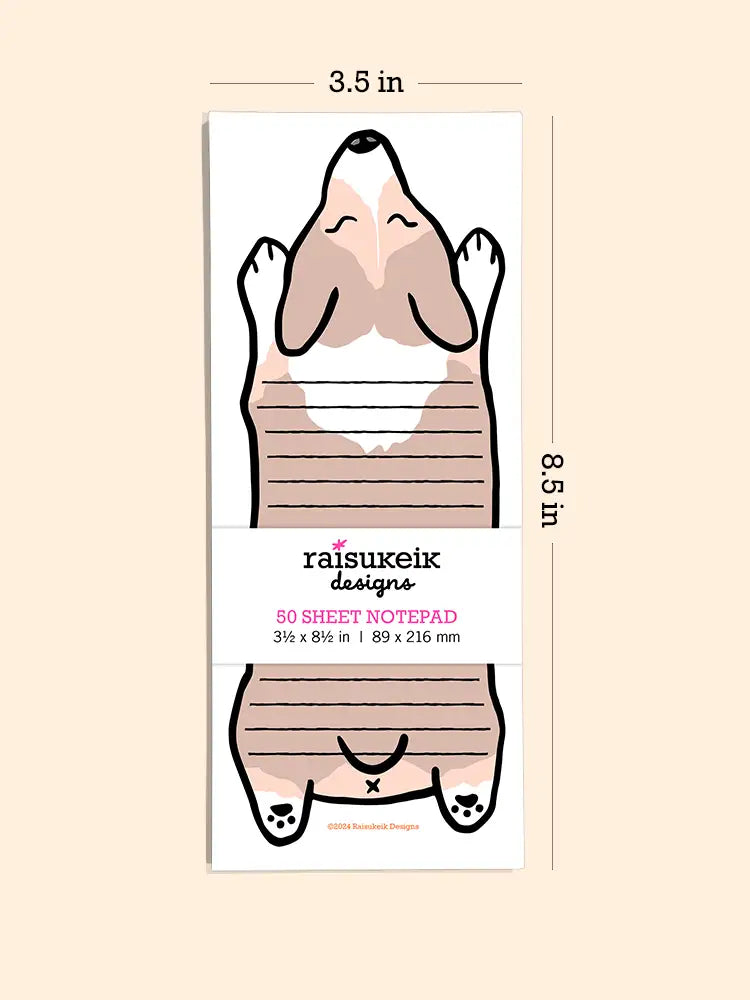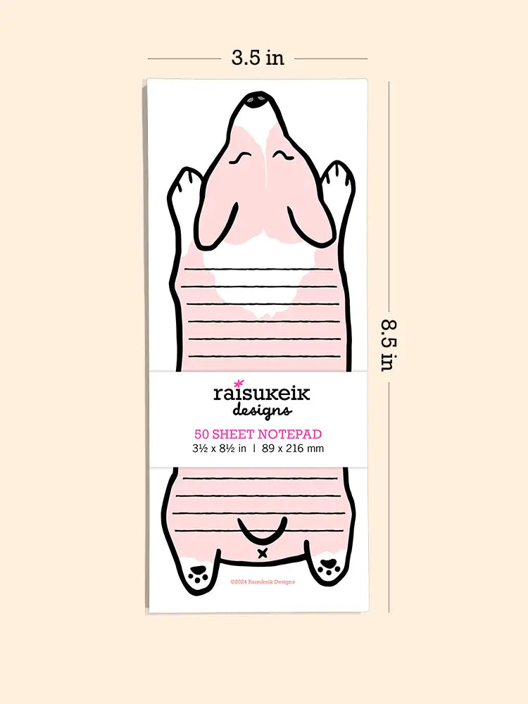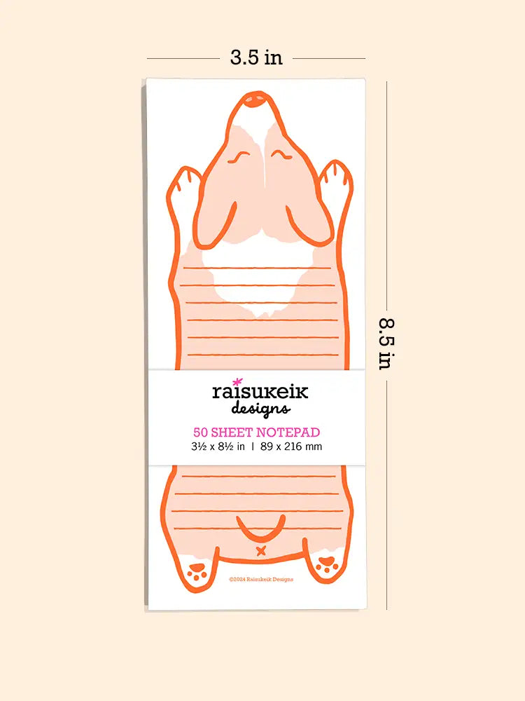 Add a touch of cuteness to your everyday note taking with this 3.5" x 8.5" lined notepad, featuring a corgi in a stretched-out pose (aka: the sploot). Risograph printed for vibrant colors, this notepad is as charming as it is functional. Perfect for jotting down ideas and to-do lists, it makes a delightful gift for dog lovers and stationery enthusiasts.