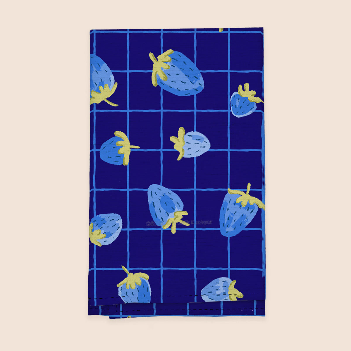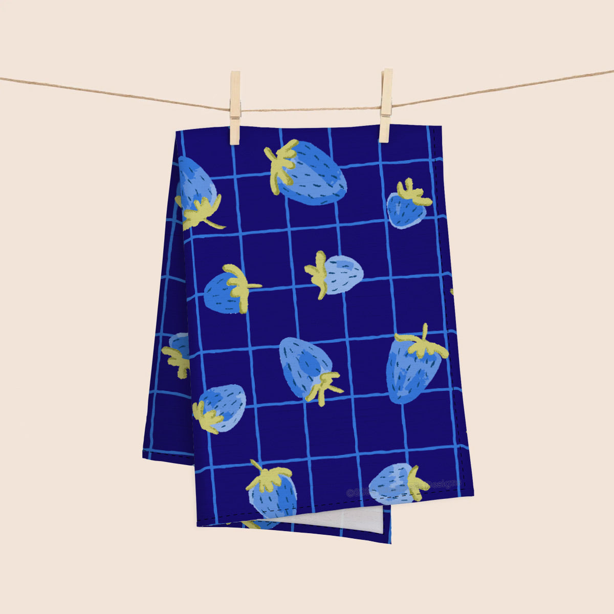 Enjoy the fruits of summer with this deliciously refreshing tea towel designed by Raisukeik Designs. Multiple hand drawn strawberries float over a blue grid with dark blue background.