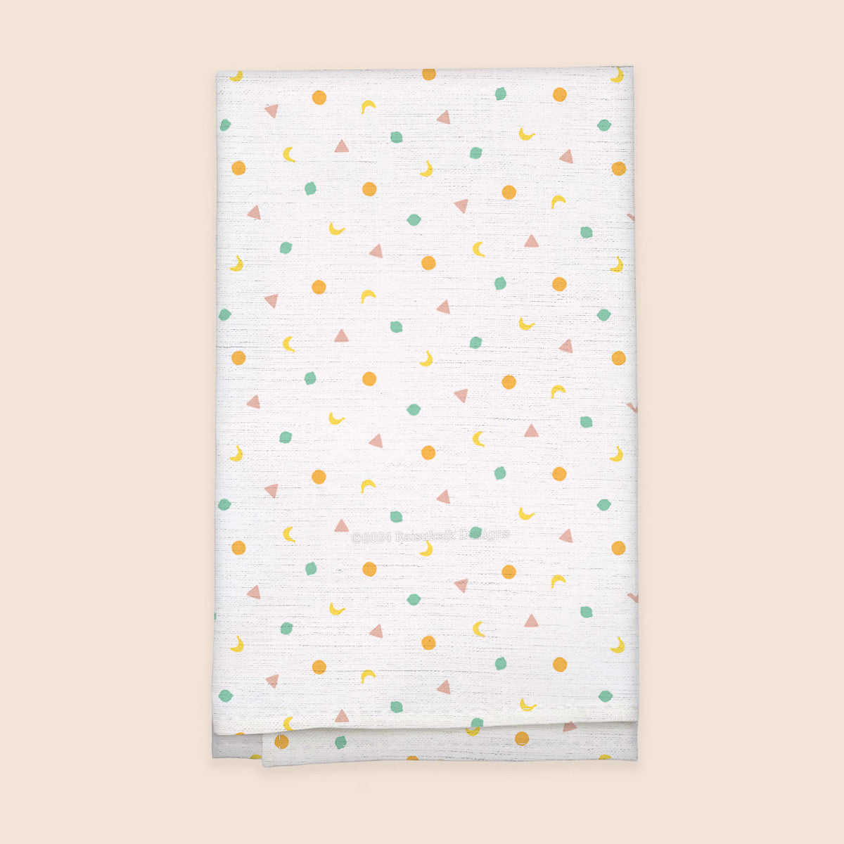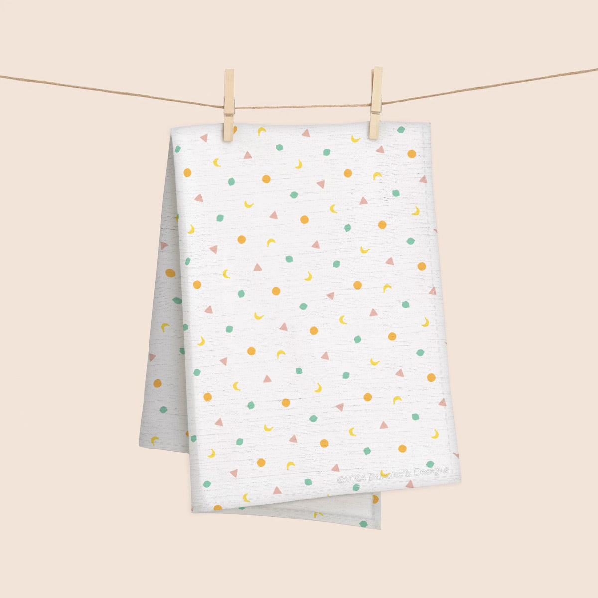 Colorful confetti in simplified shapes of limes, oranges, bananas, and strawberries floating over the white background of this tea towel designed by Raisukeik Designs.