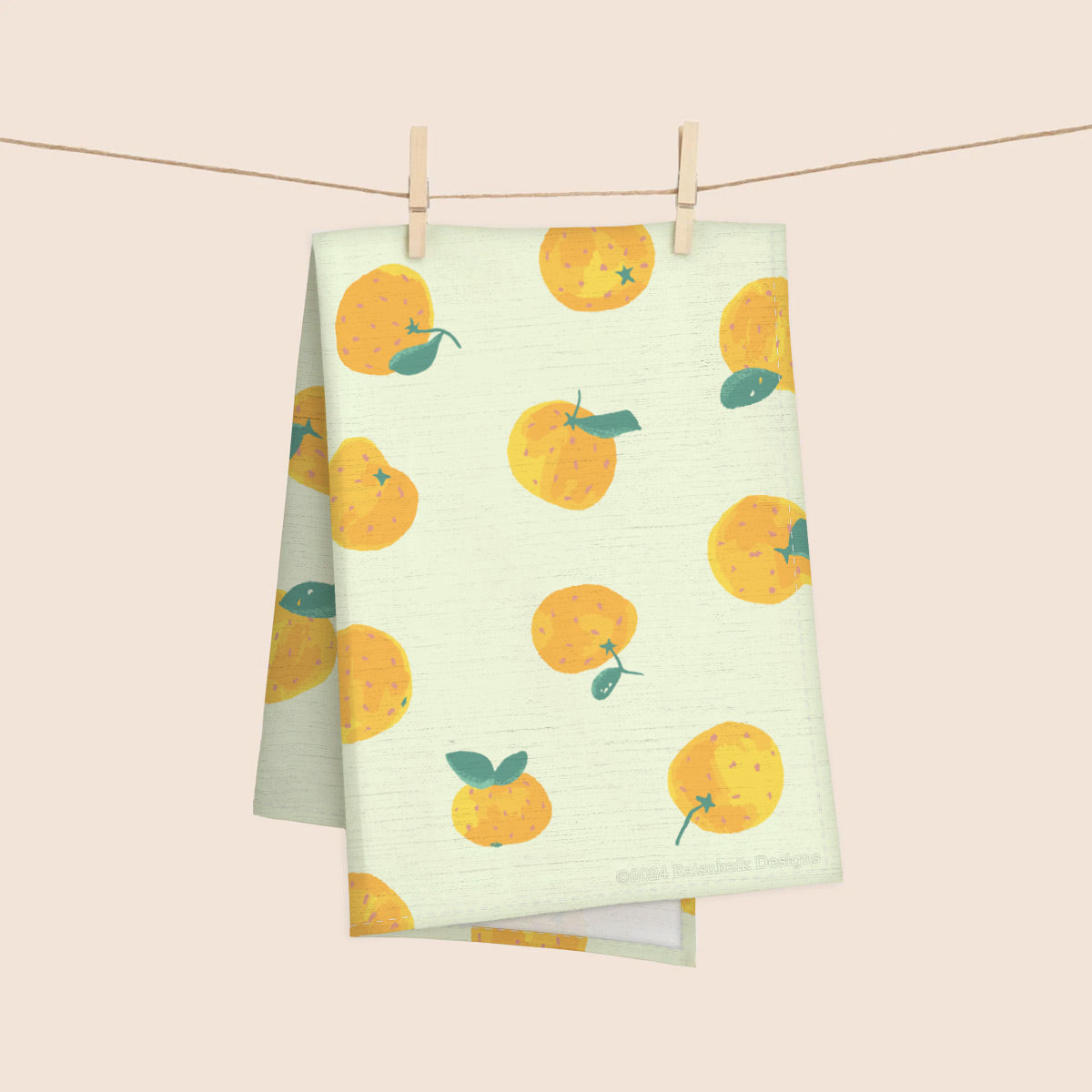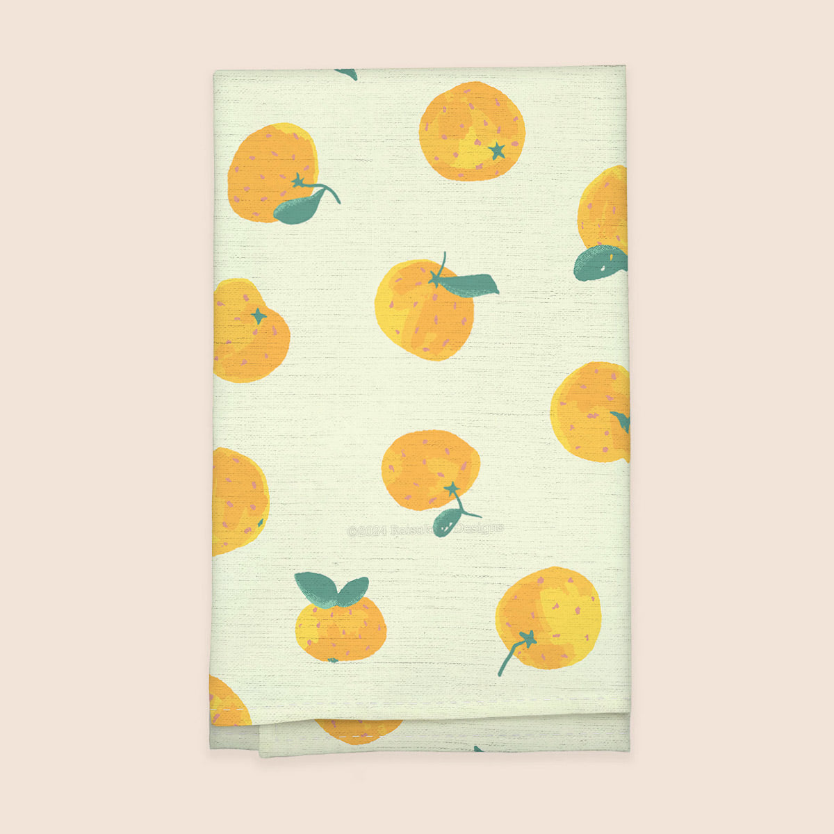 Enjoy the fruits of summer with this deliciously refreshing tea towel designed by Raisukeik Designs. Multiple hand drawn oranges float over a light sage green background.