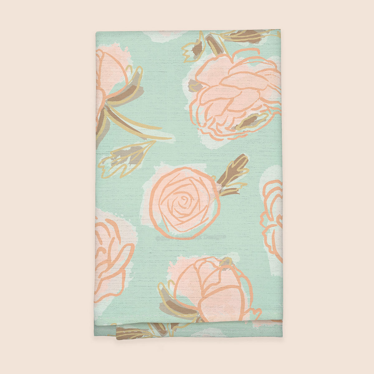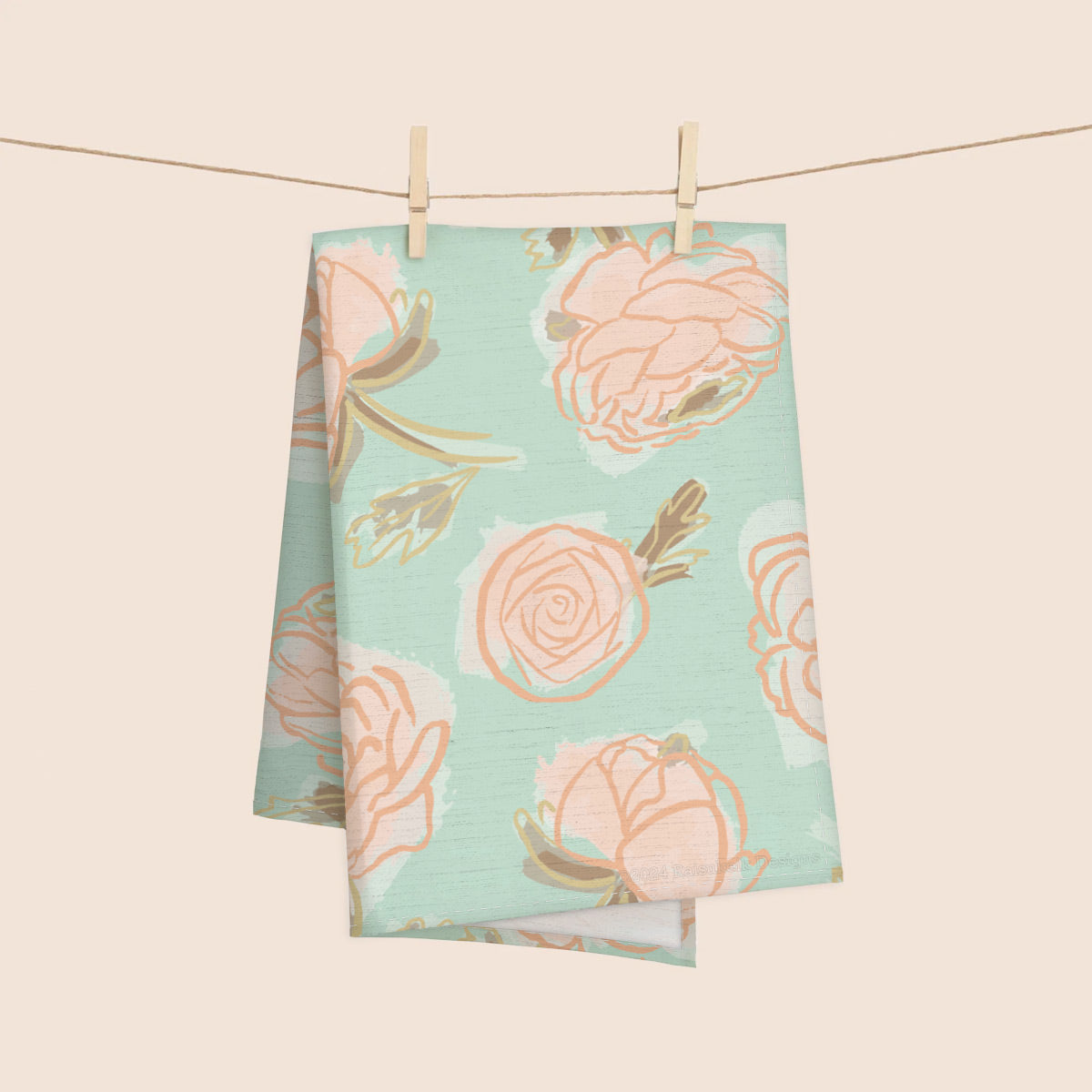 Featuring big & bold Ranunculus flowers (visually similar to peonies) in a dusty pink set over a greenish teal background, this tea towel designed by Raisukeik Designs is both a functional and artistic addition to any home.