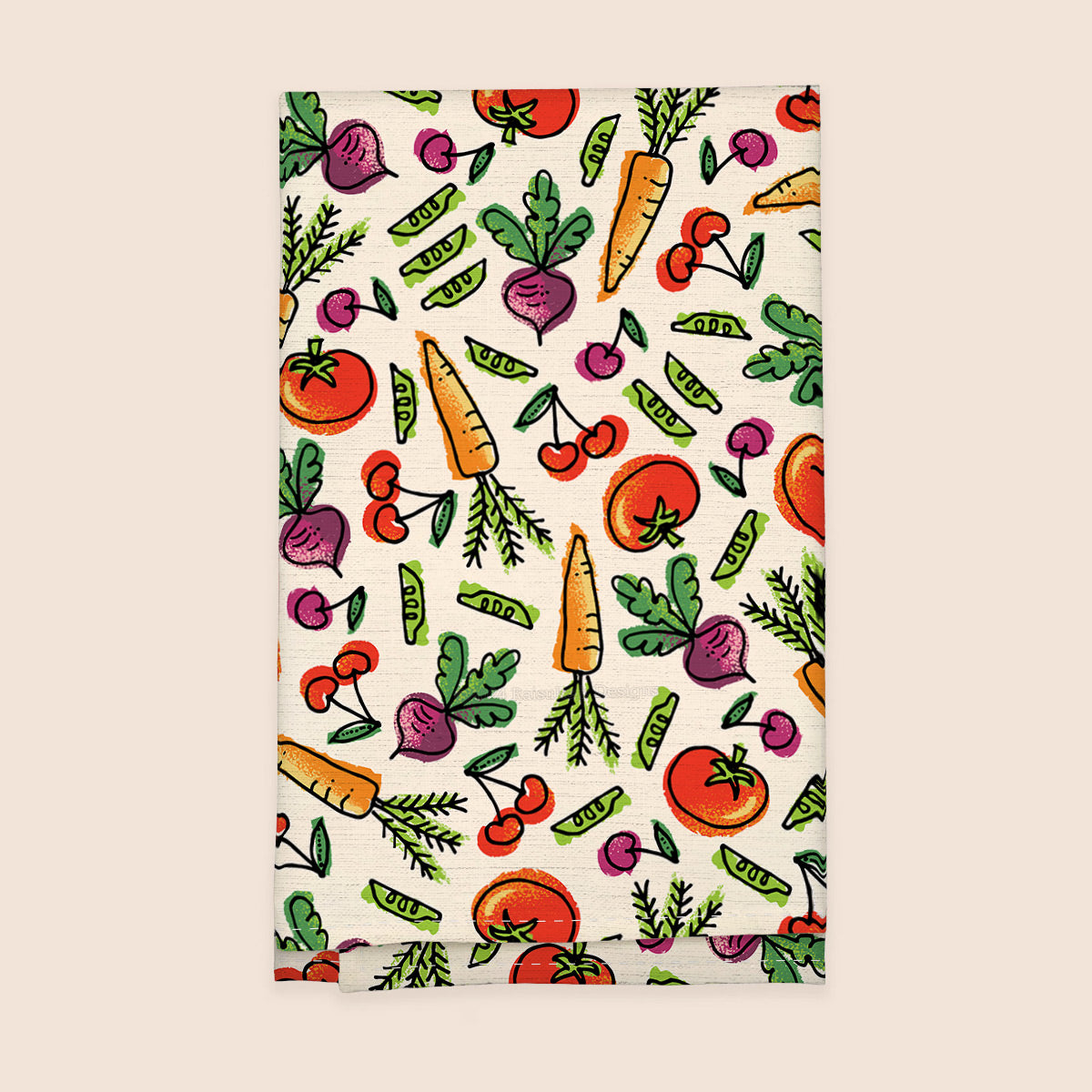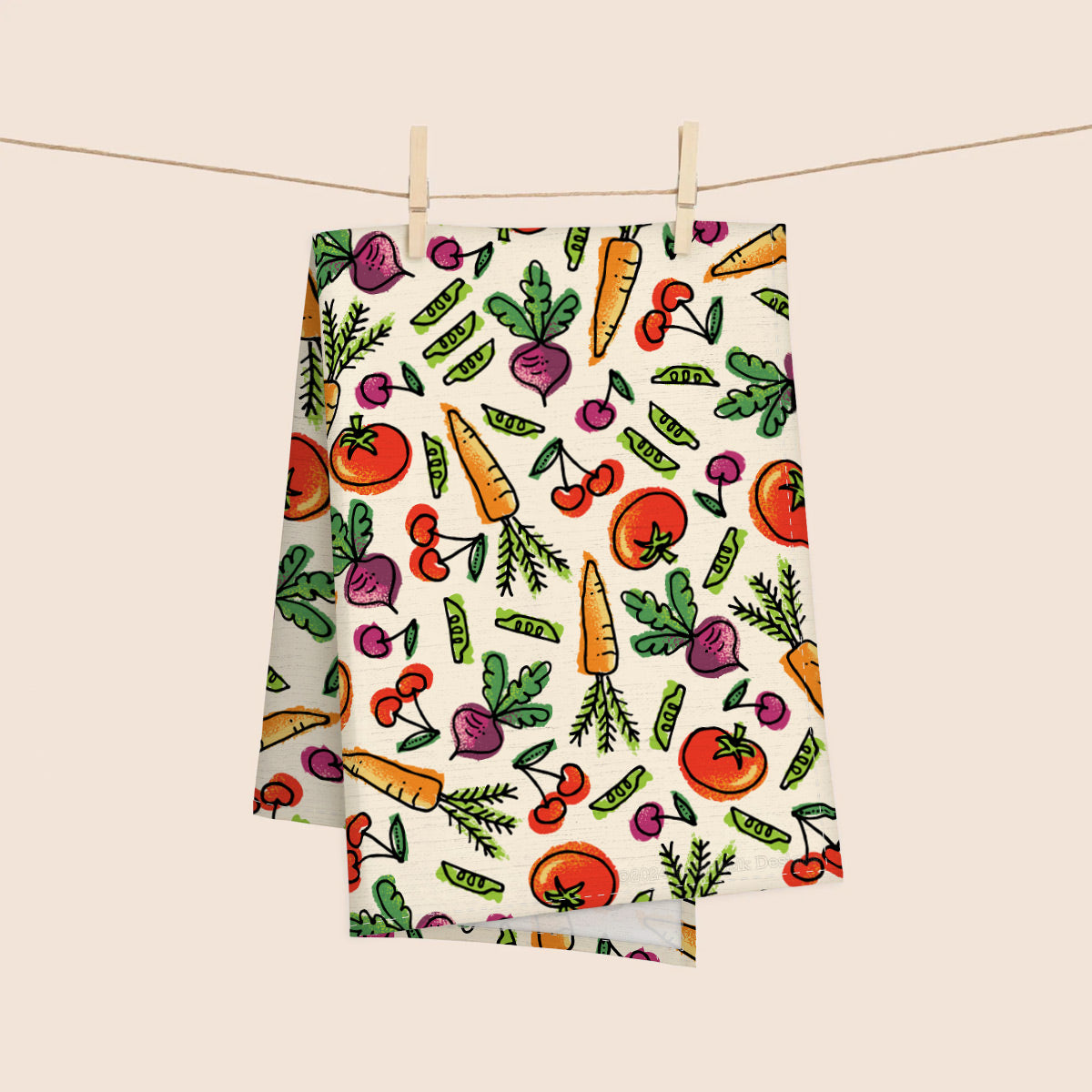 A assortment of cartoon fruits and veggies with a mid-century modern feel drawn in a textured brush style by Raisukeik Designs. Colorful carrots, tomatoes, beets, cherries, and snow peas float over a creamy light yellow background. Whether you're a food lover, a home cook, this tea towel makes for a delightful and thoughtful gift.