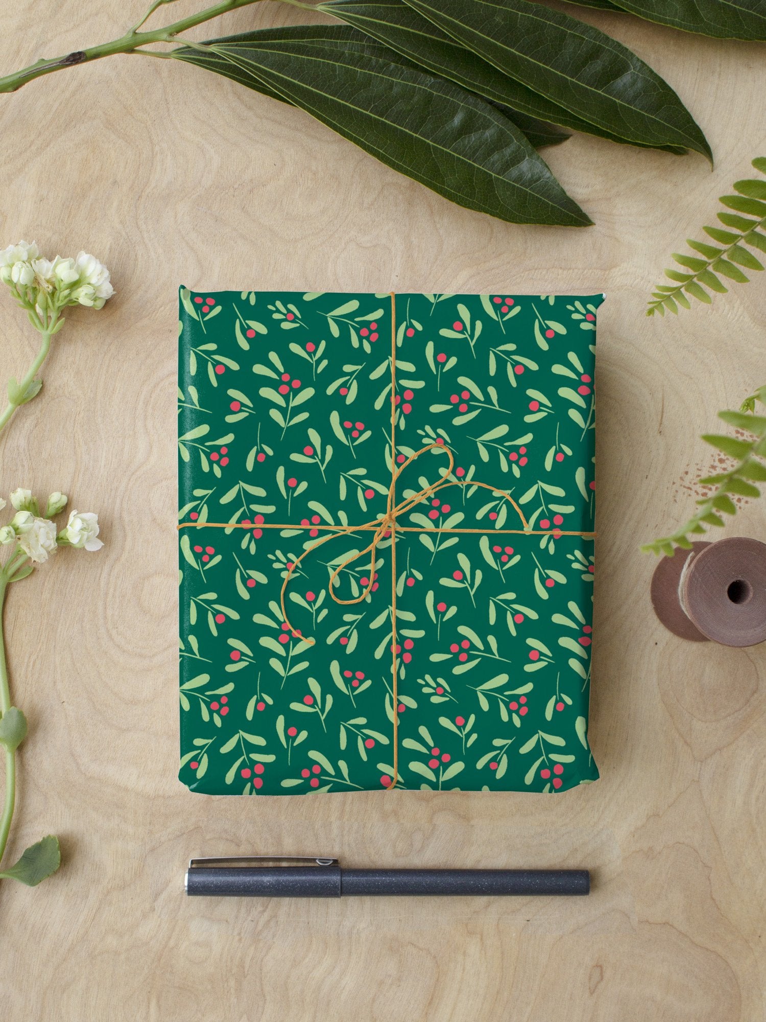 This bold wrapping paper features green mistletoe leaf sprigs with cheerful red berries over a dark forest green background.